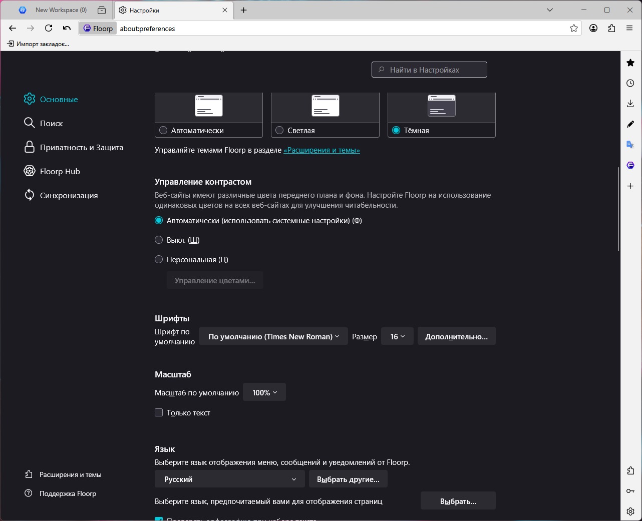 Интерфейс: Floorp Browser дает вам возможность изменять тему браузера и адаптировать его под различные стили и пользовательские интерфейсы. Например, Floorp Fluerial UI имитирует стиль Google Chrome, а Microsoft Fluent UI меняет тему на стиль Microsoft Edge.