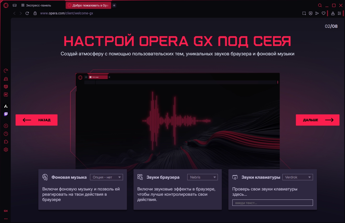 GX ЗВУК• Opera GX имеет встроенные в браузер звуковые эффекты. Звуковые эффекты можно включать и выключать в настройках.