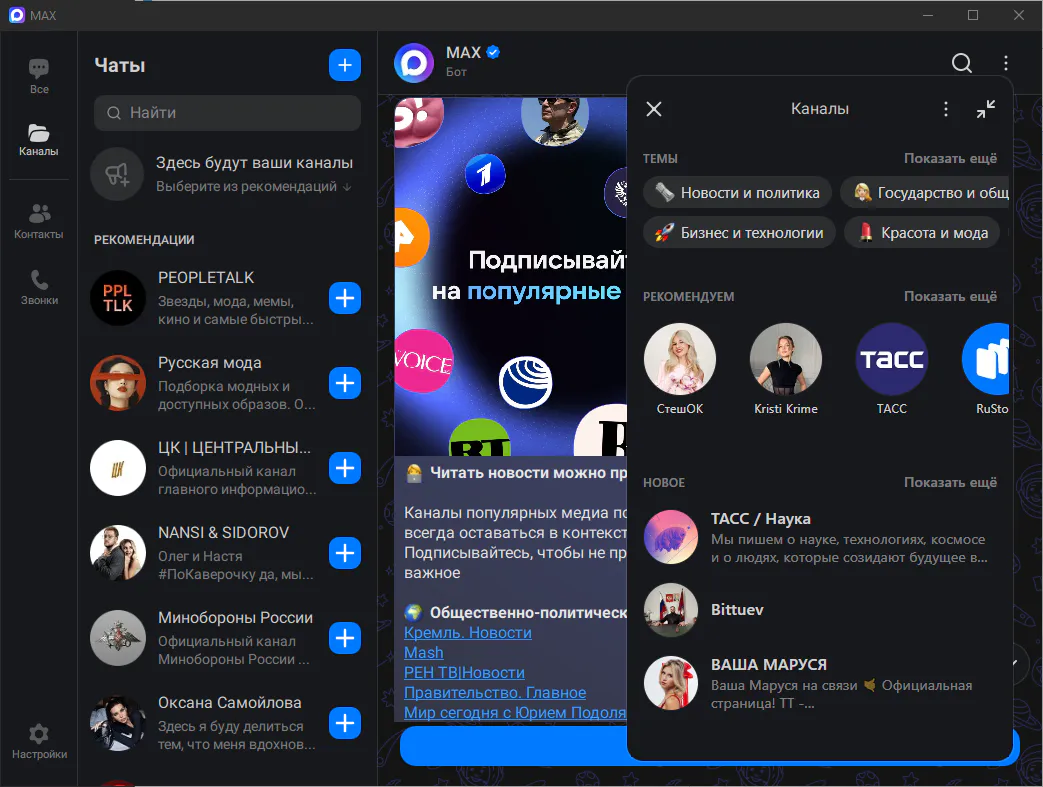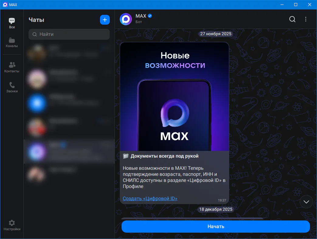 MAX - приложение для общения и решения повседневных задач. Общайтесь в удовольствие благодаря высокому качеству связи и быстрому соединению даже в сетях со слабым сигналом. Анимированные стикеры, реакции в чатах, возможность отправки файлов до 4 ГБ – все необходимое для того, чтобы делиться настроением и важной информацией. В MAX можно войти сразу с нескольких устройств, используя свой основной номер мобильного телефона. Чаты и звонки будут синхронизироваться между устройствами.