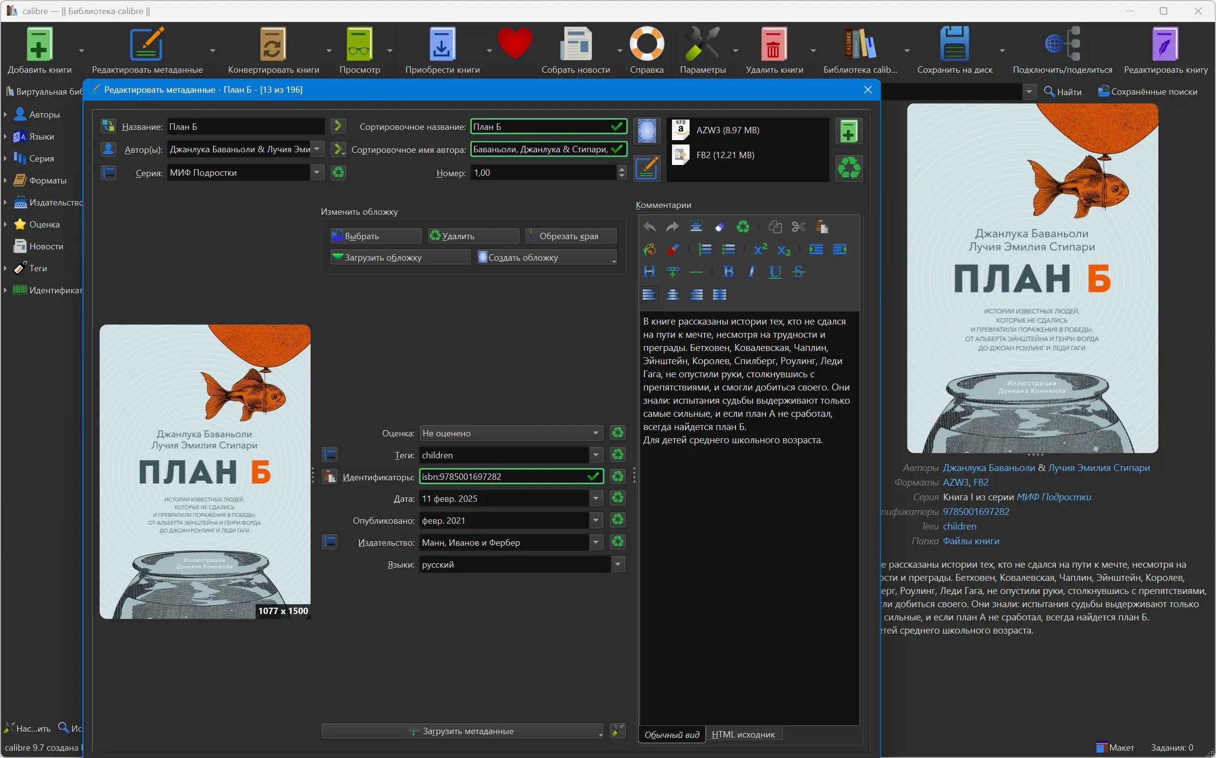 Плюс calibre может искать метаданные о книгах и обложки в интернете по названию/автору или ISBN. Система поиска метаданных определяется плагинами и легко может быть расширена самостоятельно.