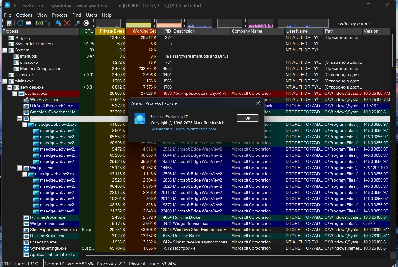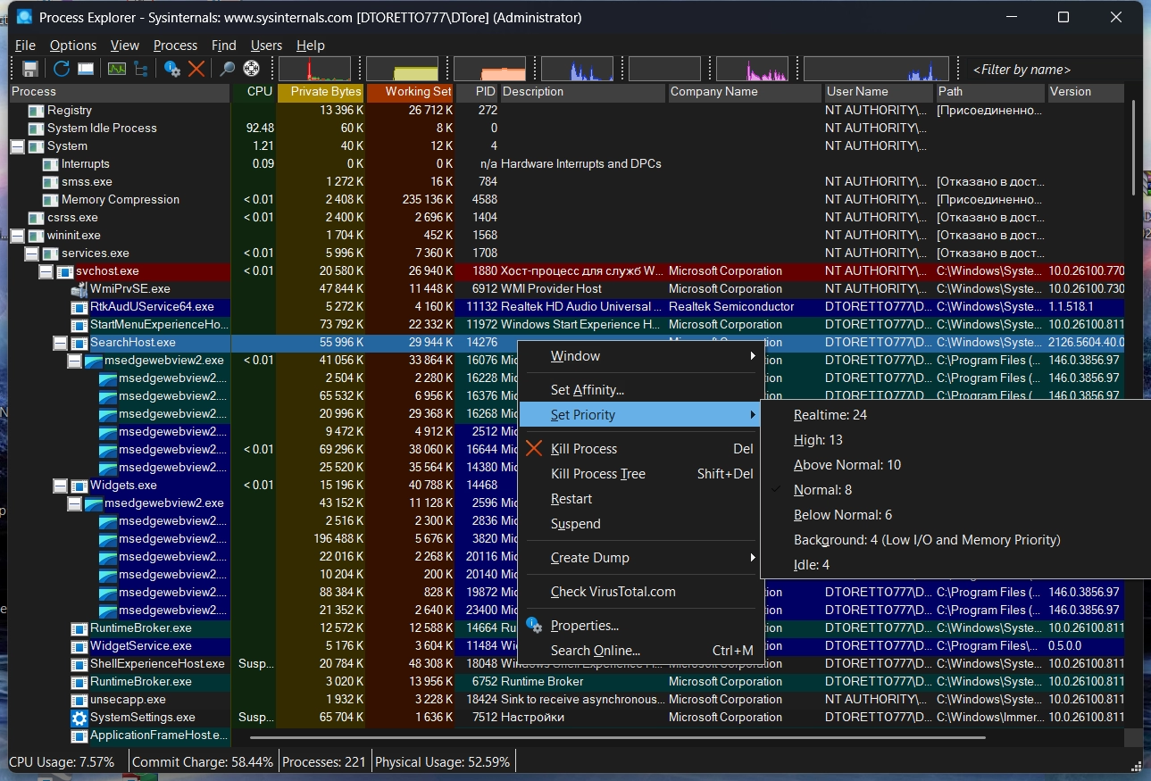 • Цветовая подсветка различных типов процессов, таких как: службы, процессы .net, процессы, работающие под той же учетной записью пользователя, что и procexp, процессы, являющиеся частью задания, и упакованные образы;