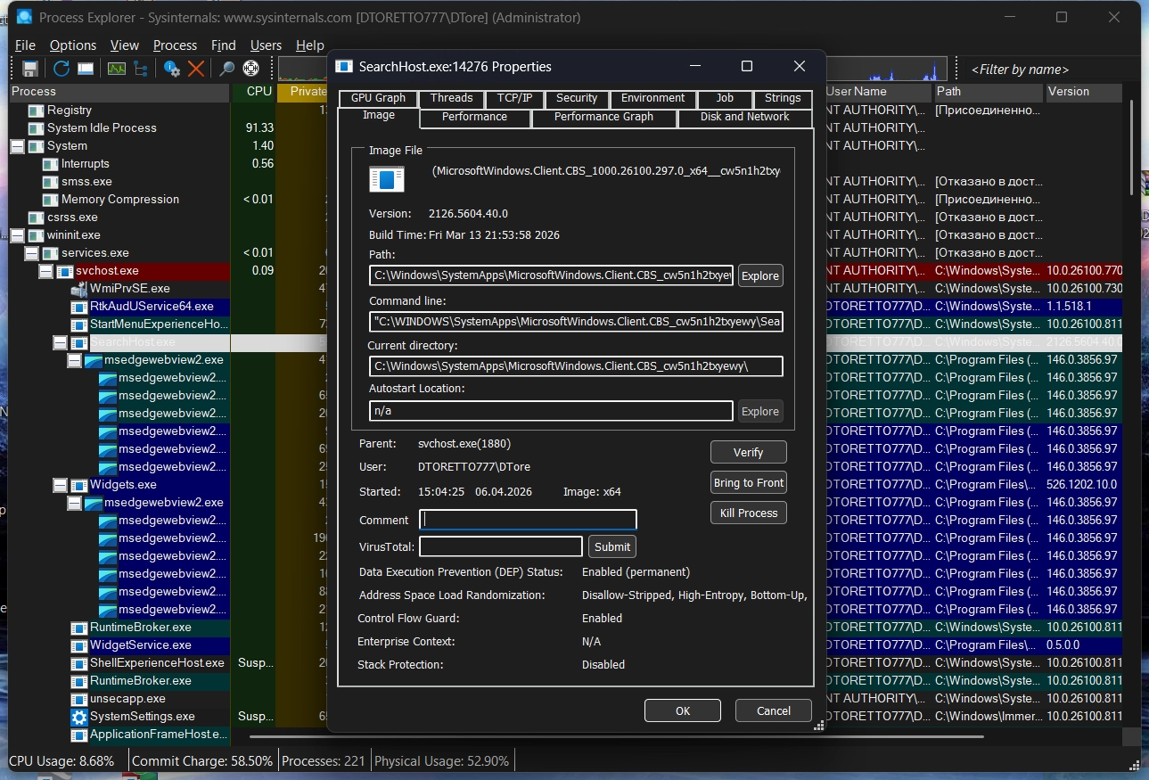 Process Explorer - утилита для управления запущенными в системе процессами, превосходящая по своим параметрам Диспетчер задач Windows. Программа отображает в своем окне подробную информацию о процессе, включая полный путь, инициализатор автозапуска, показатель выявления на VirusTotal, статистику использования памяти, процессора, диска и сети, учетную запись пользователя, атрибуты безопасности и многое другое.