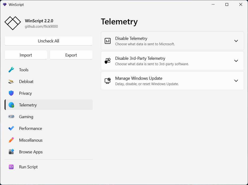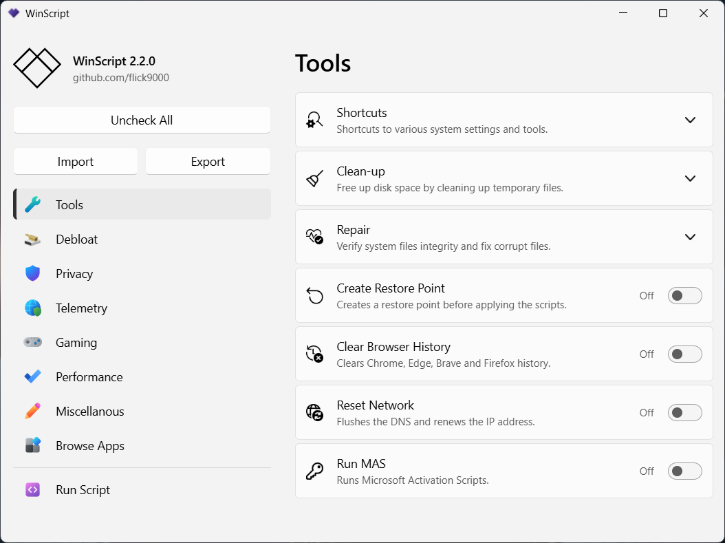 WinScript — инструмент с открытым исходным кодом, предназначенный для улучшения и персонализации работы с Windows. Он предлагает широкий спектр функций, включая удаление лишних приложений, повышение конфиденциальности, оптимизацию производительности и упрощенную установку приложений.