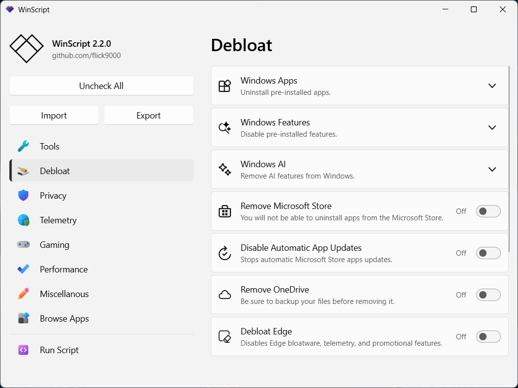 Удаление лишних компонентов• WinScript позволяет удалить из Windows любое предустановленное ненужное ПО и лишние компоненты. Вы можете удалить Microsoft Store, OneDrive, CoPilot, очистить систему от лишних компонентов или удалить Microsoft Edge, отключить виджеты и виджеты панели задач, отключить такие функции Windows, как Recall или «Потребительские функции», а также многое другое.