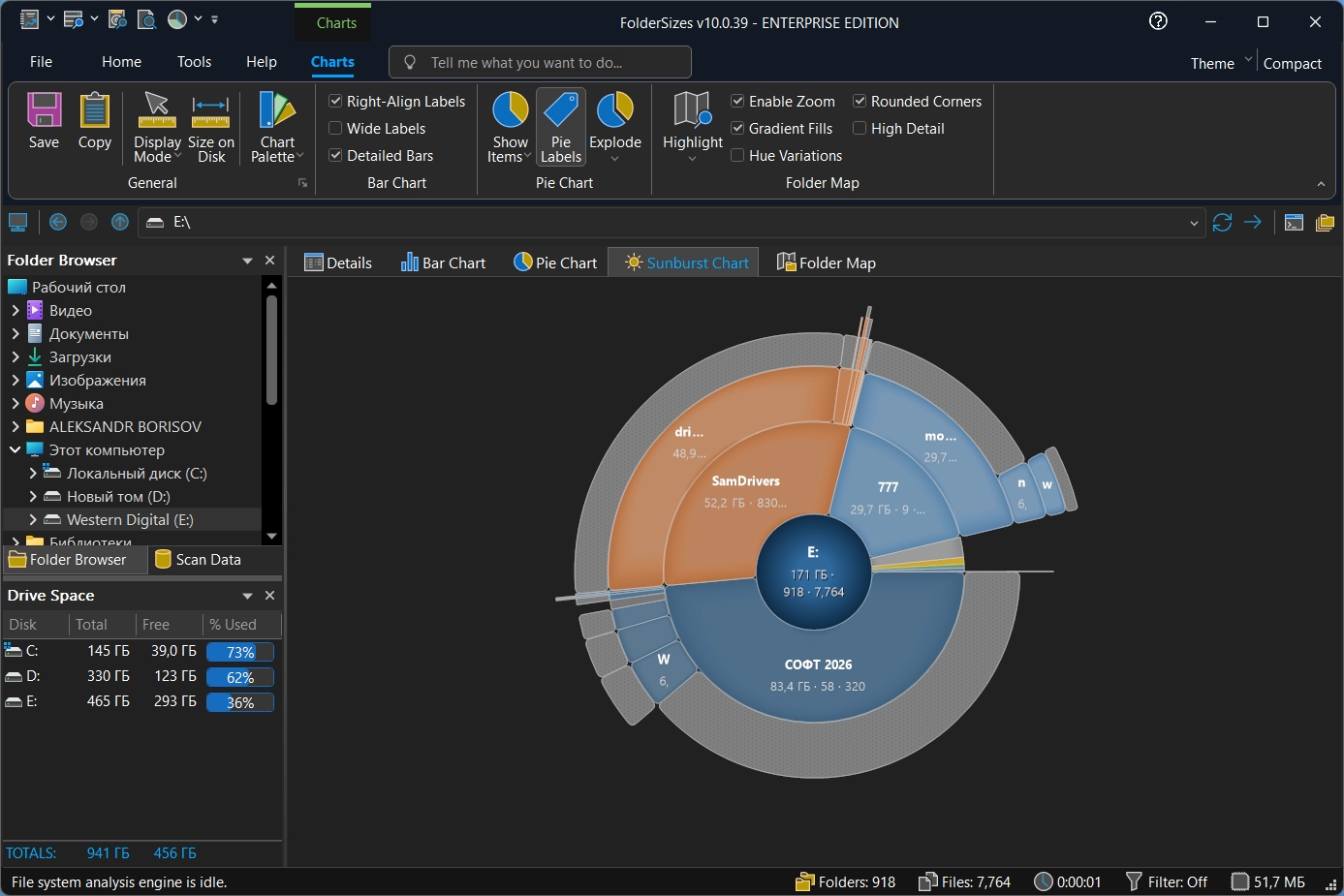 Графики размера папок, диаграммы, визуализацииВизуализируйте распределение файлов и папок по файловым системам.