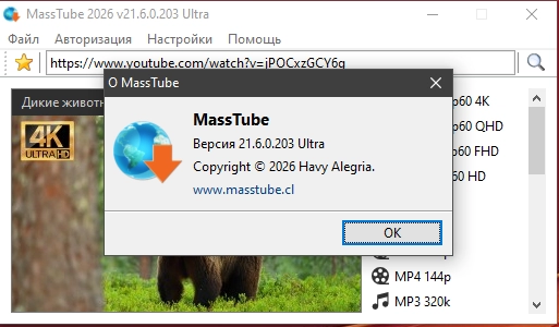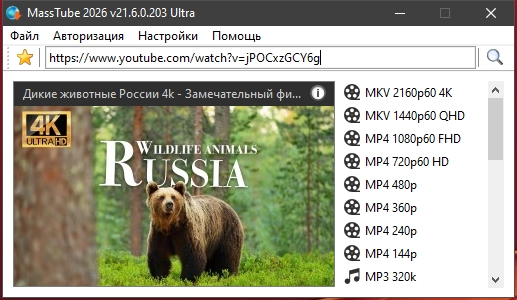 Одна из лучших в своем классе программа для скачивания видео с YouTube (и не только) - MassTube Ultra. Достаточно в строку поиска вставить адрес понравившегося ролика и нажать поиск, после чего программа предоставит список форматов и разрешений, в которых можно быстро скачать данный клип.