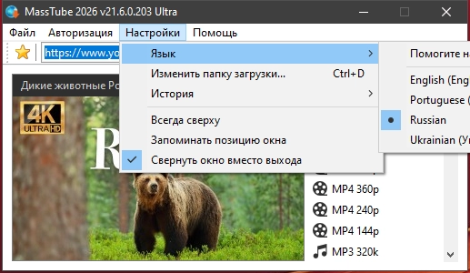Особенностью MassTube Plus является то, что благодаря этой программе возможно скачивать видео с YouTube не вводя логин и обходя ограничения возраста для видео. Все ссылки, по которым были воспроизведены скачивания сохраняются в историю (избранное), где Вы потом сможете ими воспользоваться или удалить.